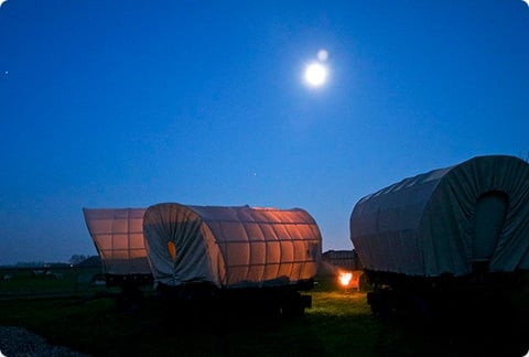 Het is heerlijk slapen in onze huifkarren. Ze zijn voorzien van lekkere matrassen, goede dekbedden, bedlinnen en mooie dekens met fraaie western-prints. De huifkarren worden geplaatst op een mooie plek op ons terrein, afhankelijk van hoe de wind staat. We zoeken de beste plek: beschut en met fraai uitzicht. Er is een huifkar voor twee personen: een voor één tot twee personen en een huifkar voor twee tot vier personen
